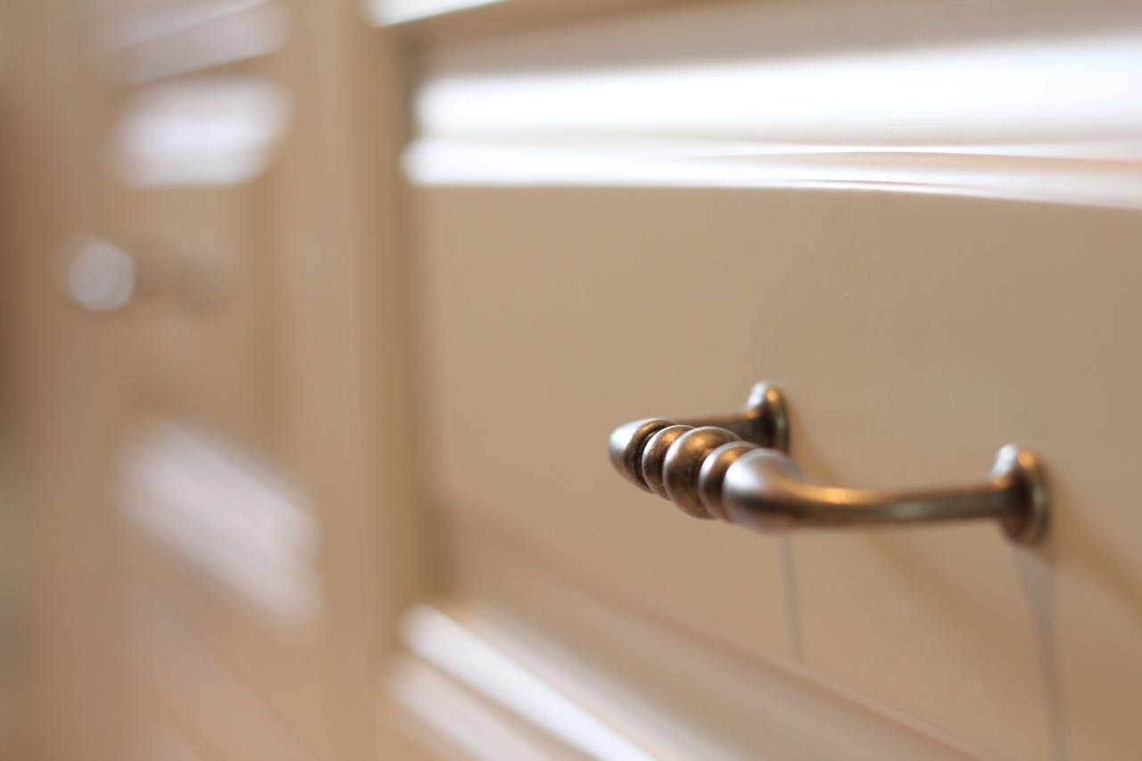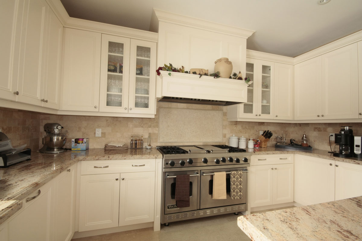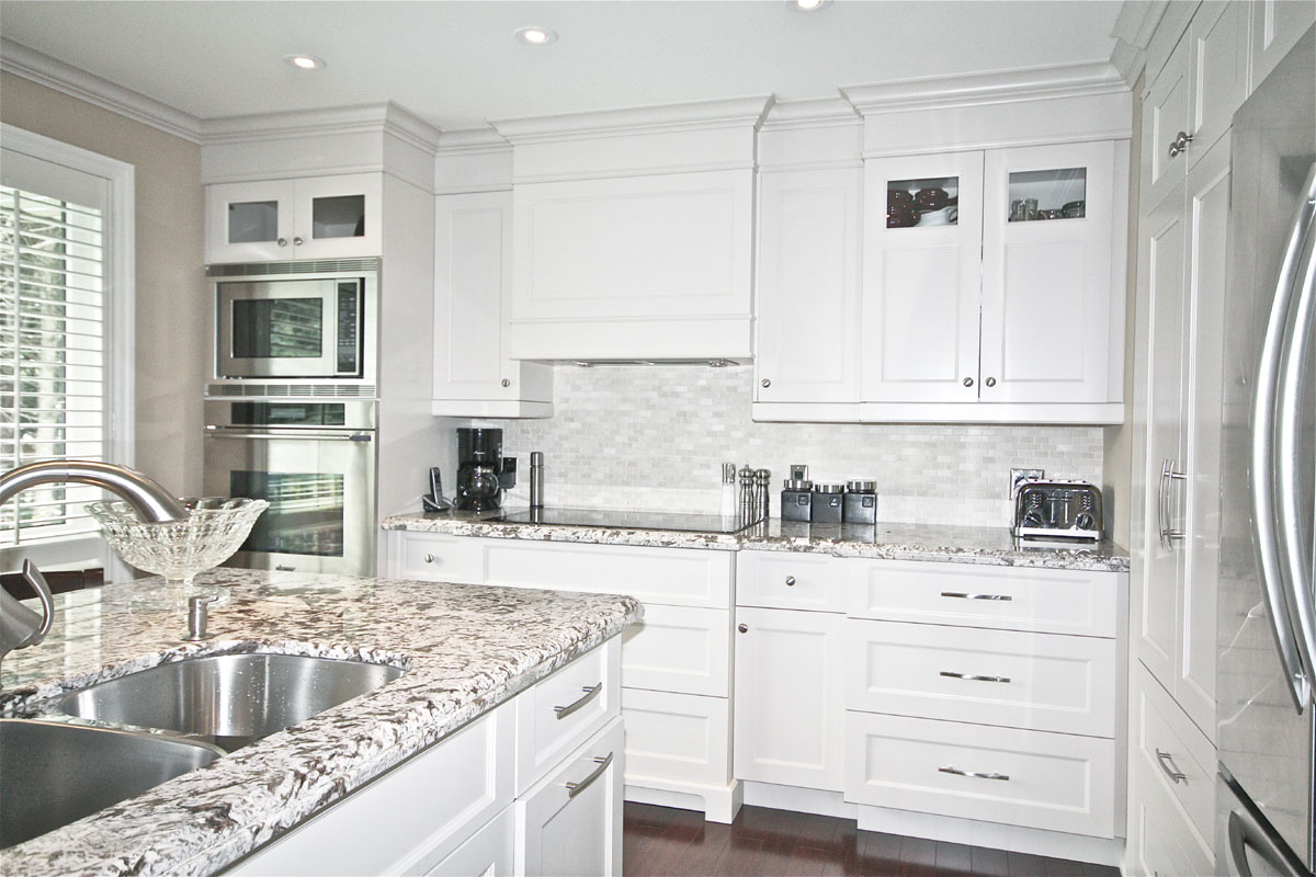 Kitchen renovation with high-quality cabinetry, additional storage pantries, built-in fridge, crown and granite counter.